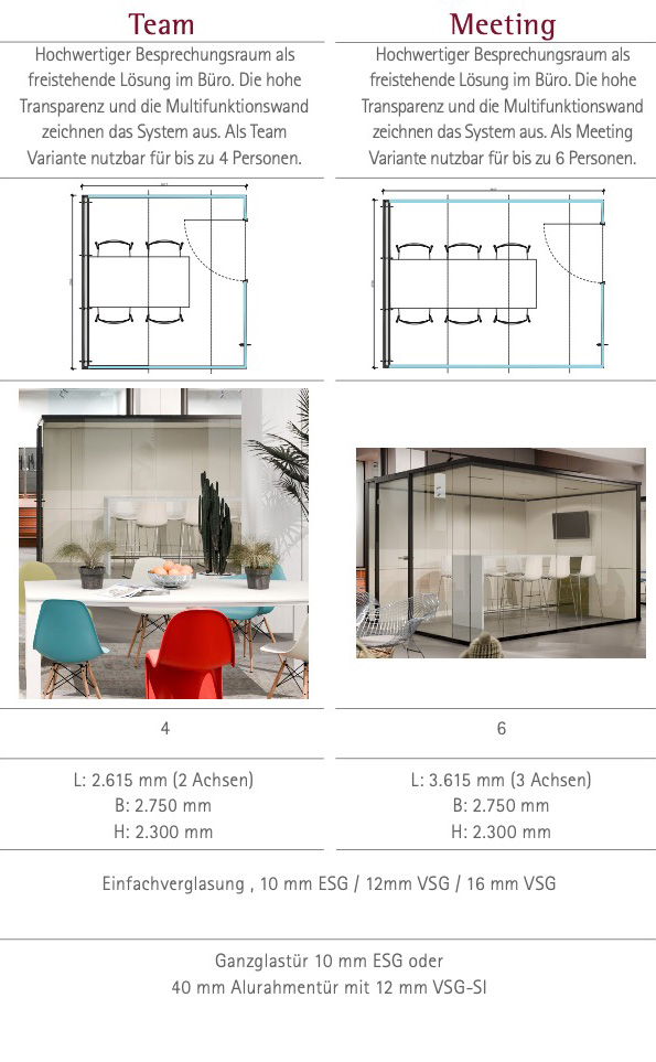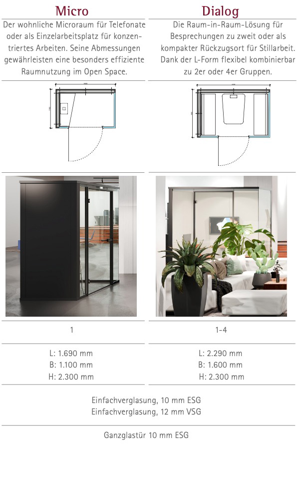 Unsere Raum-in-Raum-Systeme lassen sich in vielen unterschiedlichen Varianten ausführen. Die vier Grundtypen (Micro, Dialog, Team und Meeting) sind mit Einfachverglasung und in verschiedenen Farbvarianten realisierbar. Für erhöhte Schallschutzanforderungen kann zum Beispiel das doppelt verglaste System Kubus II eingesetzt werden. Ebenso können die Farben der Profile, Stoffe und der Wandelemente individuell kombiniert werden. Wir beraten Sie gerne über die vielen Möglichkeiten!